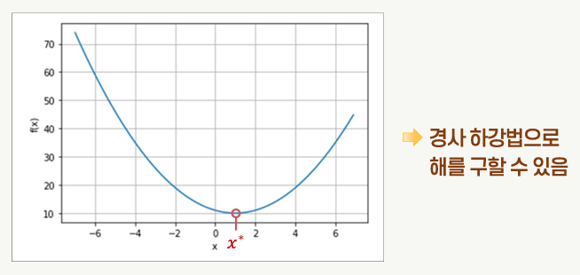 - 목적 함수가 볼록함수(convex function)이고 해를 찾기 위한 정의역이 볼록집합(convex set)인 최적화 문제