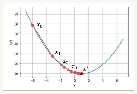- 초기값 x0으로부터 시작하여 경사를 따라 이동하여 목적함수의 최소값에 해당되는 지점인 x*에 도달하는 방법