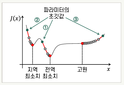 - 목적함수가 볼록함수가 아니라면 지역 최소점, 안장점 등에 의해 최적해를 찾지 못할 가능성이 있다.