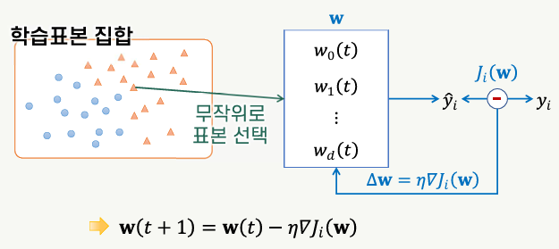 - 훈련 집합에서 무작위 순서로 하나씩 표본에 대한 경사를 계산하여 파라미터 업데이트