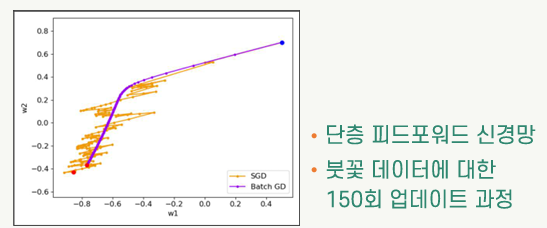 - 배치 경사 하강법에 비해 빠르게 파라미터 업데이트 진행