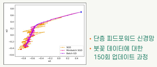 - 무작위로 표본을 선택하므로 배치 경사 하강법에 비해 파라미터의 변화가 불규칙하게 진행됨