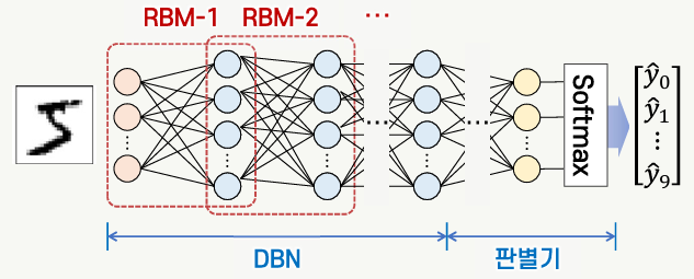 - 심층 신뢰망을 사전 학습하여 연결가중치를 초기화