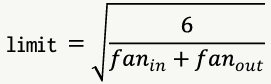 - 연결 가중치를 뉴런의 fan-in(한 뉴런에 들어오는 입력의 수)과 fan-out(한 뉴런에서 나가는 출력의 수)에 따라 결정되는 값의 범위에 속하는 랜덤 값으로 초기화