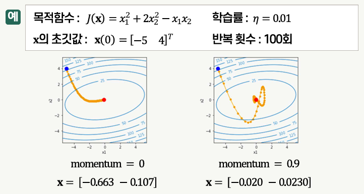 - 이전 업데이트 양을 일정 비율 반영하여 파라미터를 업데이트하는 방법