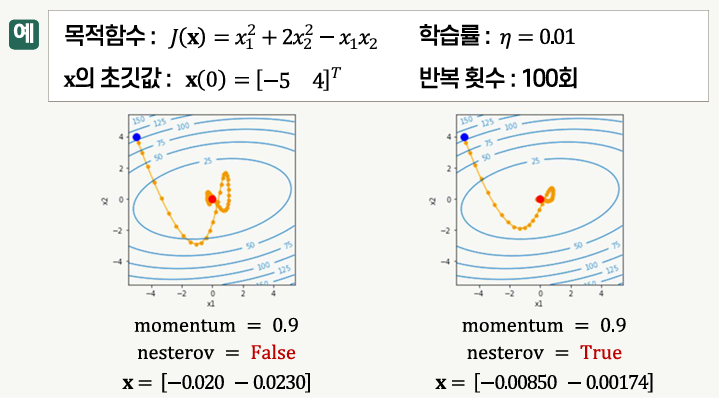 - 경사의 계산 지점을 모멘텀에 해당되는 만큼 이동한 위치에서 함으로써 파라미터 변화의 방향을 개선한 것