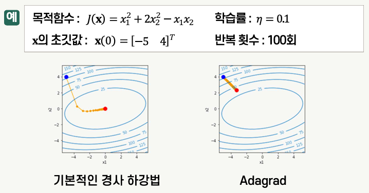 - 변화가 큰 파라미터의 학습률은 작게, 변화가 작은 파라미터의 학습률은 크게 함으로써 파라미터의 변화가 극소점을 향해 진행되게 함