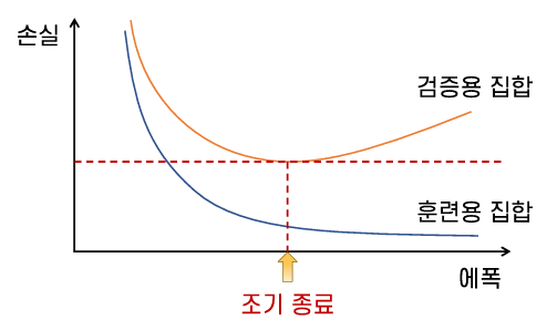 - 훈련의 조기 종료: 훈련용 집합에 대한 손실은 감소하고 있지만 검증용 집합에 대한 손실이 증가하기 시작하면 조기 종료
