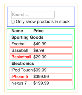 - ProductTable(연두색): 유저의 입력(user input)을 기반으로 데이터 콜렉션(data collection)을 필터링 해서 보여줍니다.